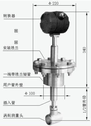 將渦街測量頭插入管道特定位置,通過測量該位置的局部流量,根據(jù)管道截面流速分布關(guān)系,計(jì)算出管道內(nèi)平均流速值。它由轉(zhuǎn)換器、插入桿組件、球閥(根據(jù)需求配 )、安裝短管(ф100)、渦街測量頭等組成。